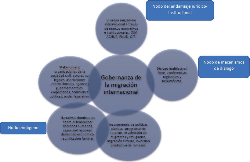 Como hemos comentado líneas arribas en el primer apartado, en tanto wicked problem, de la migración se gestiona a través de un esquema de gobernanza en red en donde existen una serie de nodos como los marcos normativos e institucionales los instrumentos facilitadores del diálogo entre Estados y los nodos de las narrativas e instrumentos de política pública que coexisten en los contextos nacionales.