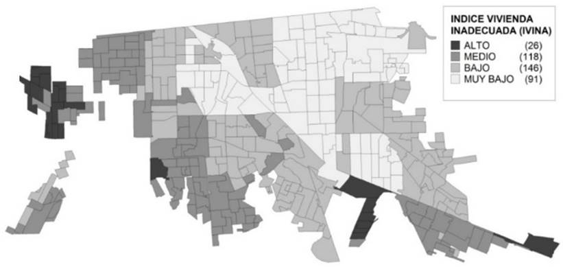 Con respecto a la distribución espacial de las viviendas inadecuadas, la Figura 2 muestra el mapa temático del IVINA, donde se observa que la vivienda inadecuada se localiza en la periferia oeste y sureste de la urbe, situación que puede ser resultado del crecimiento acelerado de la ciudad que rebasó la capacidad local de dotación de suelo, vivienda, equipamiento, empleo e infraestructura 29. Por su parte, la vivienda adecuada se posiciona en el centro (acumulación de equipamiento) y noreste (zonas residenciales).