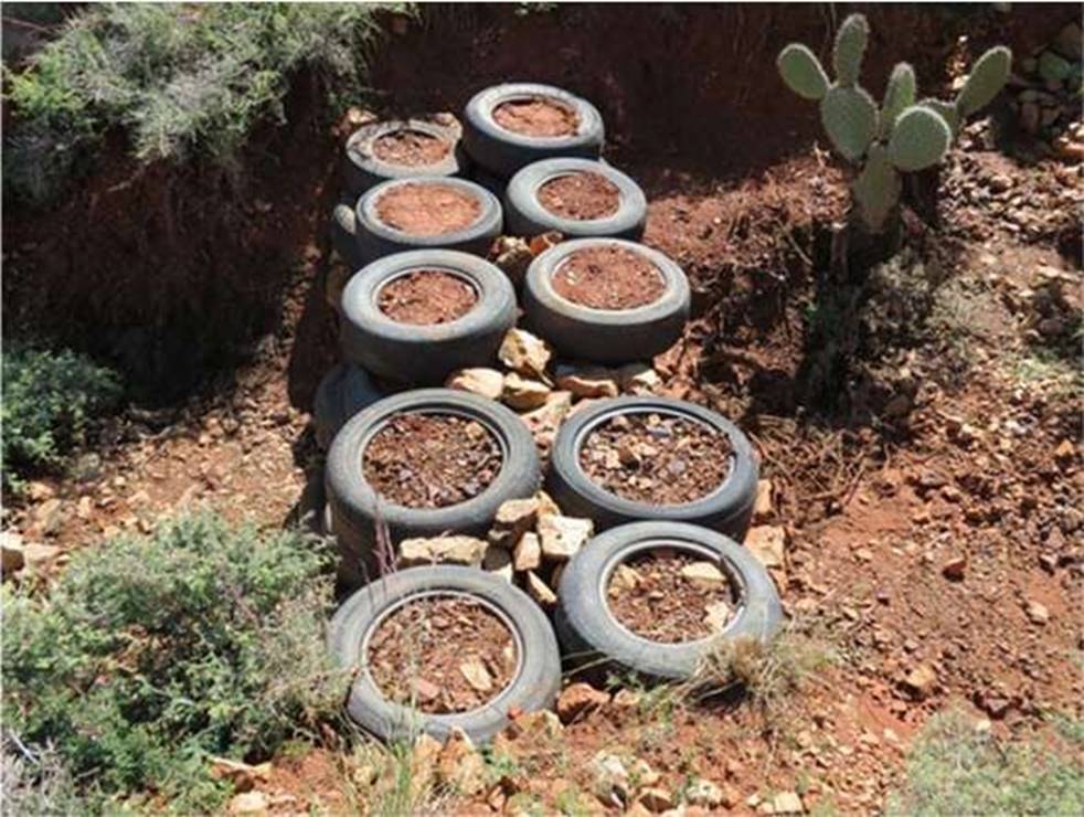 Una vez concluida la exclusión del predio se realizaron las obras de restauración de suelos como zanjas bordo manual, barreras vivas, terrazas individuales y presas de llantas. Esto con el objetivo de tratar de contener la degradación, retener la humedad en el suelo y prepararla para el momento de la reforestación 25.