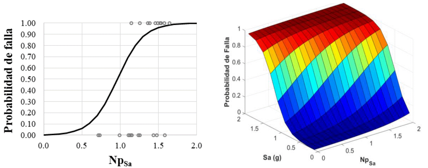 Por lo tanto se consideró que la estructura falla si excedía este parámetro, asignándole un valor de 1 y si no fallaba (no excedía el valor límite) se le asignó un valor de 0. Después se asociaron estos valores a las MIS calculadas AMS, VMS, TD ID, RT1,T2, NpSa, Npv Y NpSv. para cada sismo utilizado. Finalmente, se tabulan estos valores de falla-MIS para trazar las curvas de fragilidad y falla-MISV para generar las superficies de fragilidad correspondientes. Esto último se logra aplicando una regresión logística multinomial mediante la ecuación (1) considerando los valores de cada componente de la MISV. Esta regresión permitirá obtener la probabilidad de falla para desarrollar superficies de fragilidad con cada una de las MISV.