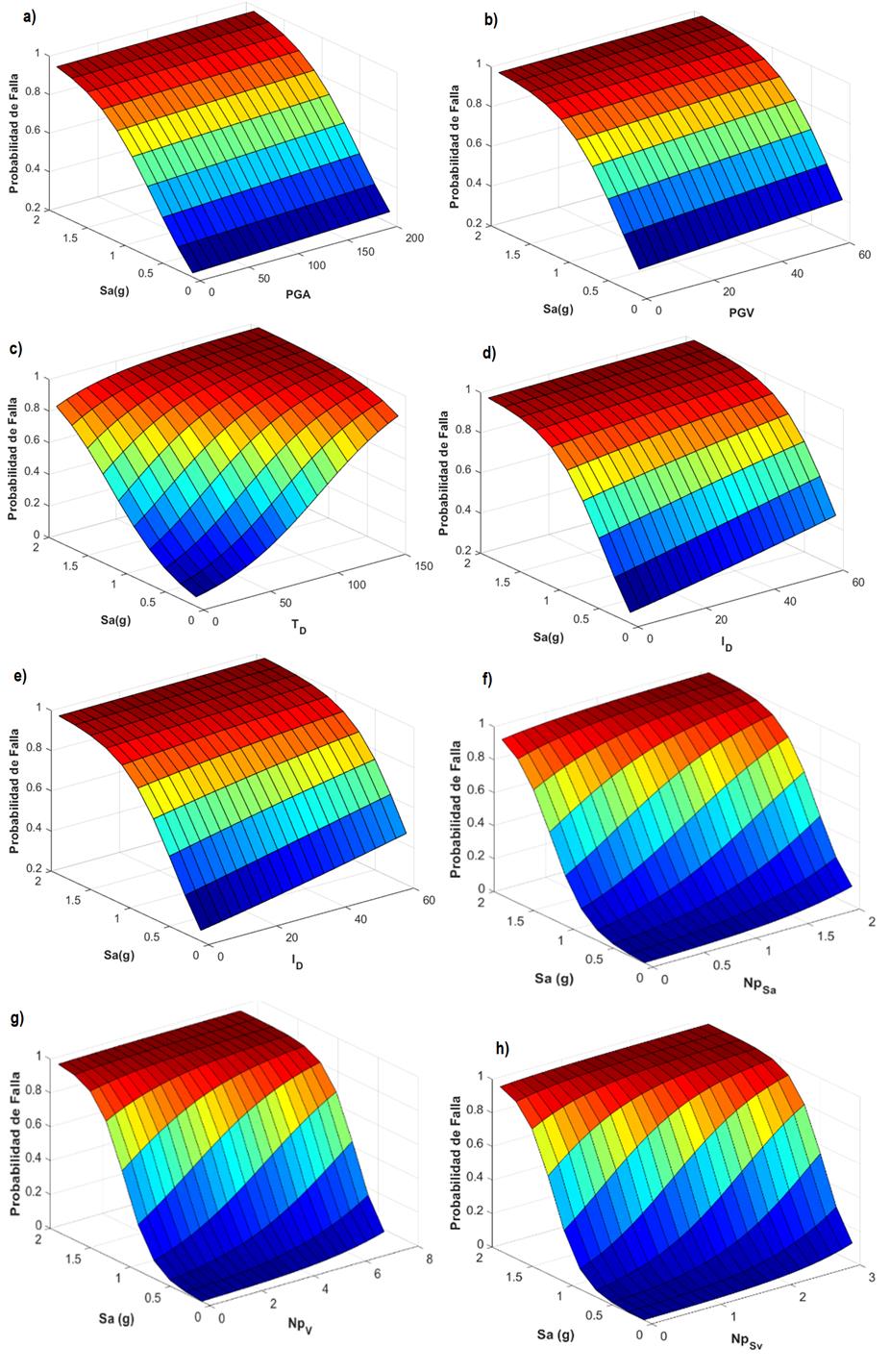 En los siguientes párrafos se describen las superficies de fragilidad resultantes mostradas en la Figura 4, obtenidas a partir de la probabilidad de falla aplicando regresión logística multinomial a los resultados del análisis dinámico incremental del ECR de 10 niveles sometidos a los 30 registros sísmicos, considerando la DME como parámetro de demanda sísmica para Sa=1g y utilizando MISV con Sa como primera componente del vector y las MIS escalares AMS, VMS; las de duración TD, e ID; y las de forma espectral RT1,T2, NpSa, NpV y NpSv, como segunda componente del vector.