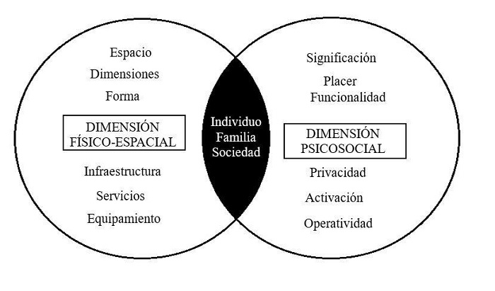 La habitabilidad tiende a satisfacer necesidades objetivas y subjetivas a partir de los espacios construidos y estas necesidades están dadas por los individuos y grupos que los habitan [18]. Esta satisfacción de las necesidades objetivas está relacionada con la dimensión físico-espacial, y la parte subjetiva con la psicosocial, cada una de estas dimensiones están inmersas en diferentes factores como se muestra en la figura 1.