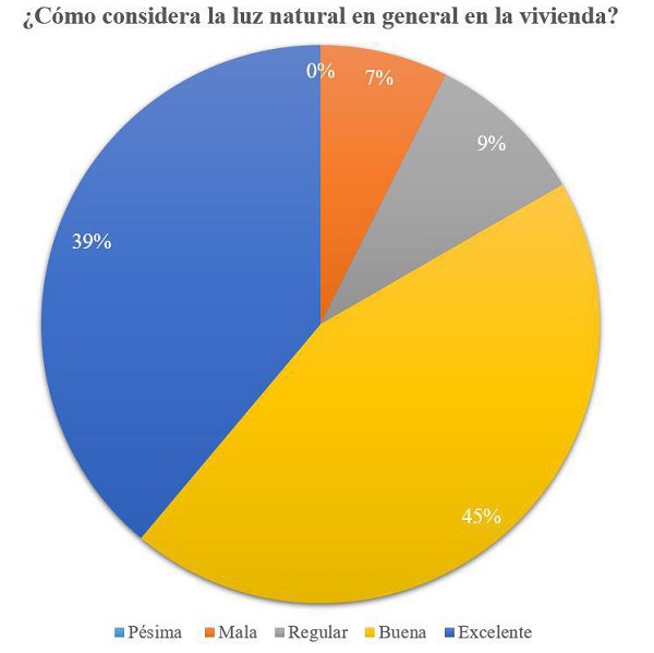 Por último, en el apartado de la habitabilidad lumínica se realizaron preguntas sobre la percepción de la luz durante todo el día y esta se comparó con la medición real de luxes emitidos en el espacio. En cuanto a la percepción, se les hizo una pregunta a los encuestados de ¿Cómo considera la luz natural en general en la vivienda? (ver figura 10), en este sentido las respuestas tuvieron un enfoque positivo puesto que el 45 % contesto que buena y el 39 % que excelente.