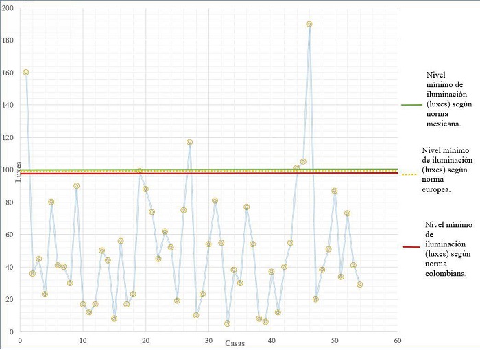 Sin embargo, al observar los datos medidos (ver figura 12), se determinó que solo seis viviendas rebasaron los 100 luxes mínimos establecidos por las normas NOM-025-STPS-2008 [29], EN 12464-1 [26], Reglamento Técnico de Iluminación y Alumbrado Público [39] y Reglamento de Construcciones para el municipio de Culiacán, Sinaloa [40]. Es decir que a pesar de que las personas perciben como bien iluminadas sus viviendas los datos levantados muestran lo contrario. Una buena iluminación sobre todo natural permite realizar las actividades cotidianas de una manera más eficiente y limita el uso de iluminación artificial por lo tanto ahorro energético y económico.