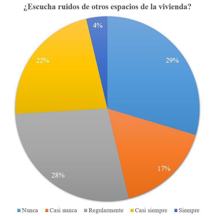 Así mismo, se preguntó por los ruidos del exterior de la vivienda, el 20 % mencionó que siempre escucha ruidos externos, el 22 % que casi siempre, el 19 % regularmente, 17 % que casi nunca mientras que el 22 % dijo nunca escucharlos. Al momento de preguntarles la intensidad de los ruidos, respondían que los de la calle eran muy intensos, y los de otras viviendas de moderados a leves.