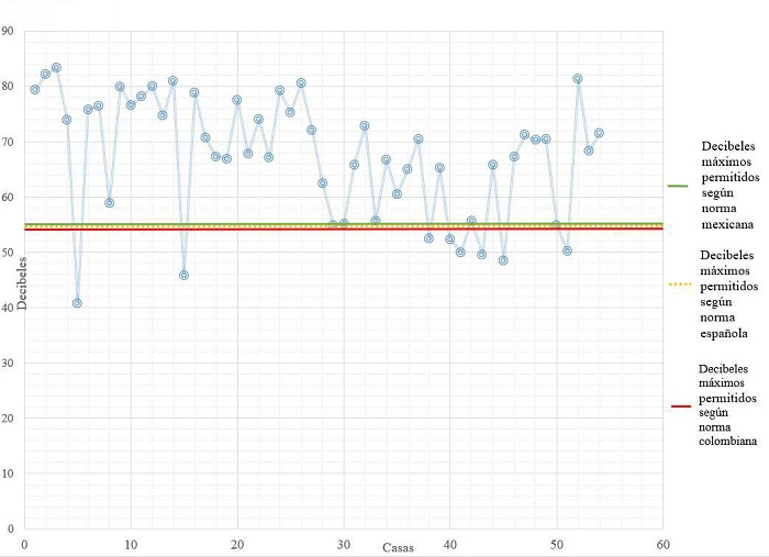 El último paso fue realizar la medición del ambiente acústico (ver figura 9), el resultado en este tipo de habitabilidad es preocupante, pues la norma mexicana NOM-081-SEMARNAT-1994 [30], la española BOE-A-2007-18397 [24] y la colombiana Norma Nacional de Emisión de Ruido y Ruido Ambiental [25], indica que el límite máximo permisible en zona habitacional debe estar entre los 50 decibeles (dB) de 22:00 a 6:00 horas y de 55 dB de 6:00 a 22:00 horas. En este sentido, en las viviendas se observó que solamente 11 de ellas se encontraron dentro del límite máximo permitido, el 80 % de las viviendas superan los estándares de decibeles máximos permitidos.