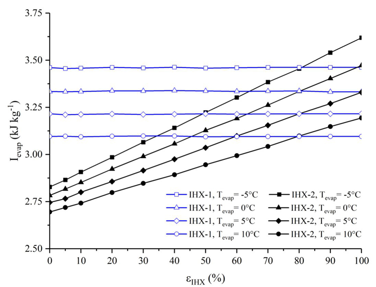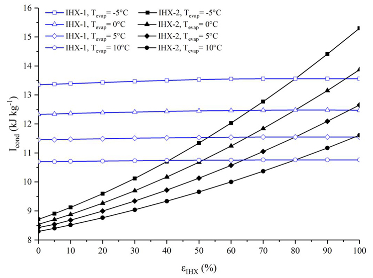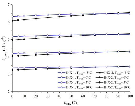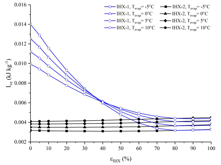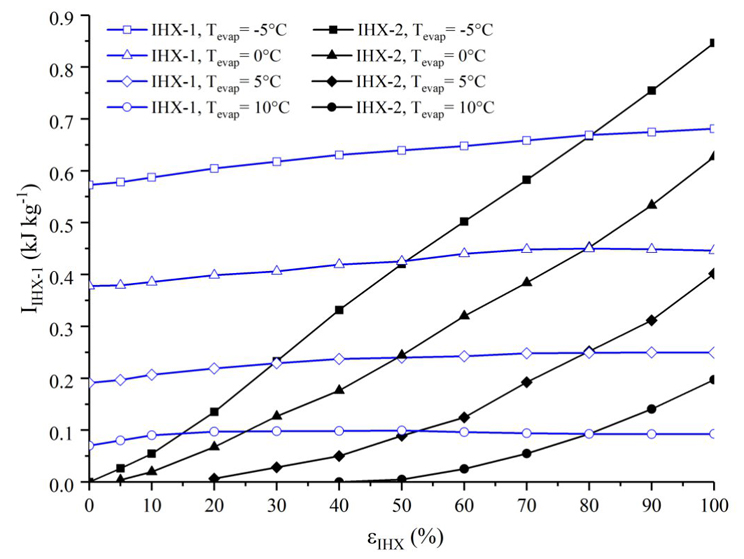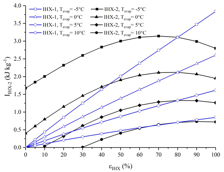 Es posible observar que la irreversibilidad en ambas configuraciones se incrementa con el aumento de la efectividad del intercambiador de calor y con la disminución de la temperatura de evaporación, esto es producido por el incremento en el grado de sobrecalentamiento que ocasiona el uso del intercambiador de calor. Para la configuración ERC+IHX-1+IHX-2(80%) la irreversibilidad se incrementa hasta alcanzar un valor máximo (alrededor de εIHX-1=70%) de 0.63, 1.32, 2.11y 3.14 kJ/kg, para temperaturas de evaporación de 10, 5, 0 y -5°C, respectivamente, y posteriormente disminuye.