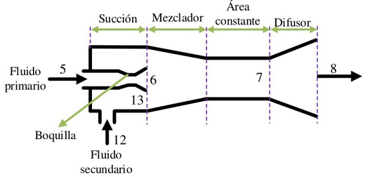 El refrigerante subenfriado (4) fluye por el segundo intercambiador de calor (IHX-2) para transferir energía al vapor saturado proveniente del evaporador (11), esto ocasiona un incremento de temperatura hasta alcanzar las condiciones de vapor sobrecalentado (12), para después ingresar, conjuntamente con el refrigerante subenfriado (5), al eyector. Posteriormente, el refrigerante subenfriado pasa a través de la boquilla (6), donde la presión se reduce hasta las condiciones del flujo que se encuentra en la etapa de baja presión (13). Dentro de la cámara de mezclado, ambos flujos se mezclan (7) e ingresan al difusor en el que su velocidad es reducida hasta su salida (8).
