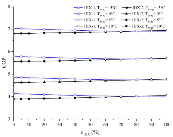 Para la configuración ERC+IHX-1(80%)+IHX-2, el COP se reduce cuando la efectividad en el IHX-2 se incrementa de 0 a 100%, siendo dichas reducciones del 2.4%, 2.2%, 1.6% y 1.7%, correspondientes a las temperaturas de evaporación de -5°C, 0°C, 5°C y 10°C, respectivamente. Entre ambas configuraciones, la configuración ERC+IHX-1(80%)+IHX-2 es la que presenta las mejores prestaciones energéticas, las cuales se obtienen a efectividades inferiores al 80% (εIHX-2<80%), mientras que para efectividades del intercambiador de calor 2 mayores al 80% εIHX-2>80%, el COP es prácticamente igual para ambas configuraciones.