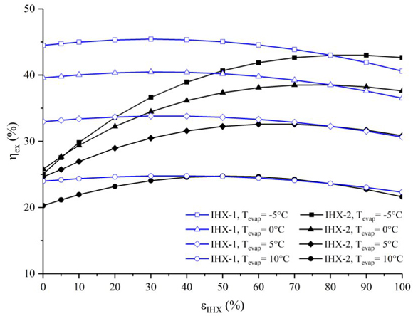 Comparativamente entre configuraciones, cuando el ciclo opera sin uno de los intercambiadores de calor, esto es εIHX=0% y una Tevap= 10°C, la eficiencia exergética de la configuración ERC+IHX-1(80%)+IHX-2 es 3.2% superior que los resultados obtenidos en la configuración ERC+IHX-1+IHX-2(80%). A medida que se reduce la temperatura de evaporación, los incrementos en la eficiencia exergética son del 28.8%, 43.8% y 62.5%, para temperaturas de evaporación de 5°C, 0°C y -5°C, respectivamente.