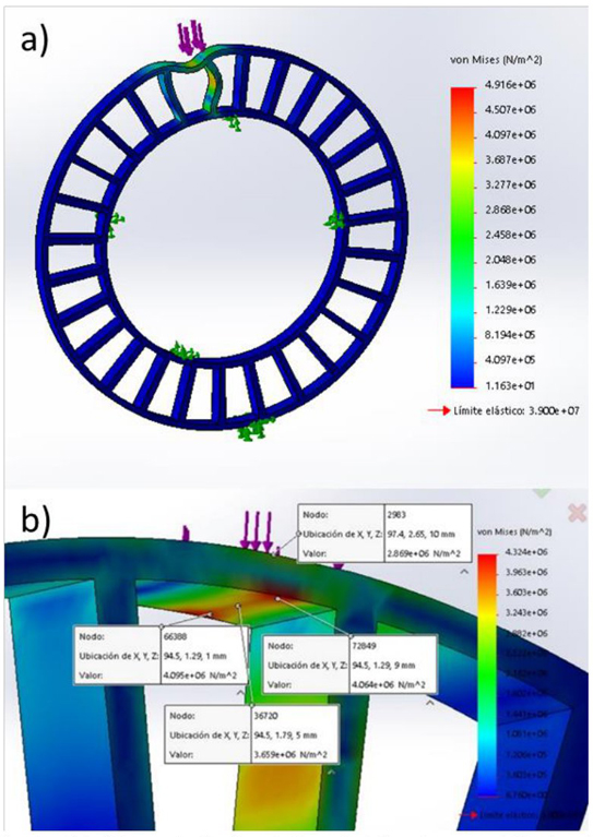2) There are zones above the elastic limit of the TPU (3.9x106 MPa), but it is minimal, which does not represent a considerable risk for the insert