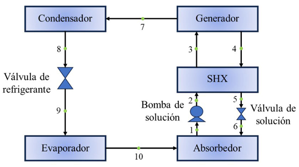En la Figura 1 se muestra el diagrama esquemático del ciclo de refrigeración por absorción de simple efecto, en el que LiBr-H2O es empleado como mezcla de trabajo. Este sistema se caracteriza por operar a bajas presiones y consiste de cuatro componentes básicos, a saber, absorbedor, generador, evaporador y condensador, así como de algunos componentes auxiliares, como son: la válvula de expansión de refrigerante, la válvula de expansión de solución, la bomba de solución y el intercambiador de calor de solución (SHX). Su principio de funcionamiento es el siguiente. Refrigerante en forma de vapor saturado es enviado al condensador (7), donde es condesado hasta alcanzar las condiciones de líquido saturado (8) y enviado a la válvula de refrigerante. A la salida de la válvula de refrigerante (9), el refrigerante, en cambio de fase, entra al evaporador, donde el calor, del espacio a enfriar, es absorbido, para luego entrar al absorbedor como vapor saturado (10). El vapor de refrigerante que deja el evaporador es absorbido por la solución débil proveniente del generador (6). La solución rica en refrigerante (1) es bombeada del absorbedor hacia el generador, provocando que se incremente la presión al ingreso del intercambiador de calor de solución (SHX). En el SHX, la solución rica en refrigerante que sale del generador (4) transfiere energía calorífica a la corriente proveniente de la bomba de solución (2), incrementando la temperatura antes de ingresar al generador (3), mientras se reduce la temperatura de la solución pobre en refrigerante que ingresa a la válvula de solución (5), para posteriormente ser enviada al absorbedor y completar el ciclo.