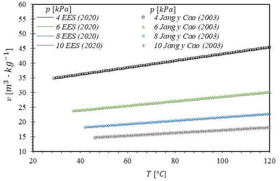 En cuanto al volumen específico para vapor sobrecalentado, Florides et al. [35] no presentan correlación para estimarlo. Jiang y Cao [31] proponen una correlación, la cual se compara con el valor obtenido por el EES [33]. Los resultados se muestran en la Figura 10. Por el traslape, no es posible observar la diferencia entre ambos valores, para todas y cada una de las presiones aquí analizadas. La correlación propuesta por Jiang y Cao [31] predice satisfactoriamente el volumen específico de vapor sobrecalentado, traslapándose con la curva de los valores obtenidos por el EES [33].