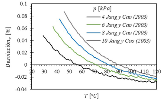 Las máximas desviaciones se obtienen para temperaturas cercanas a la de saturación. La máxima desviación es de 0.09%, correspondiente a 10 kPa y 46°C. En conclusión, la ecuación propuesta por Jiang y Cao [31] predice con mucha exactitud el volumen específico para vapor sobrecalentado.