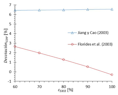 Al emplear las correlaciones propuestas por Jiang y Cao [31], es posible observar que la desviación se mantiene prácticamente constante para todo el rango de efectividad del SHX analizado. La desviación promedio del COP, al utilizar las correlaciones de Jiang y Cao [31], es de 6.5%, respecto al COP obtenido con las correlaciones propuestas por el EES [33].