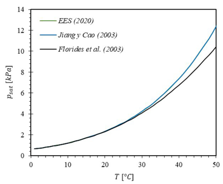 En la Figura 2 se muestran los valores obtenidos para la presión de saturación, en función de la temperatura. Es posible apreciar que, en el rango de temperaturas analizado, la ecuación propuesta por Florides et al. [35] subestima la presión de saturación. Los valores obtenidos con la ecuación propuesta por Jiang y Cao [31] se traslapan con los obtenidos por el EES [33], por lo que no se aprecia en la figura.