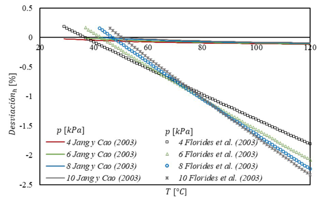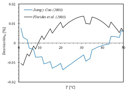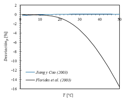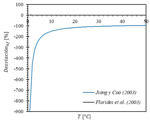 La Figura 3 muestra las desviaciones de la presión de saturación de las correlaciones propuestas por Jiang y Cao [31] y por Florides et al. [35], respecto a las del EES [33]. La desviación, en el rango de temperaturas analizado, para la ecuación propuesta por Jiang y Cao [31] es casi nula, siendo su máxima desviación de -0.23%, esto es a 1°C. La ecuación propuesta por Florides et al. [35] subestima la presión de saturación, incrementando la desviación conforme aumenta la temperatura, siendo la máxima desviación de -15.6% a 50°C. Entonces, para estimar la presión de saturación, se prefiere utilizar la ecuación propuesta por Jiang y Cao [31].