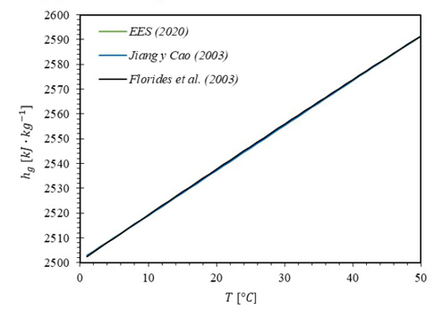 Por su parte, Florides et al. [35] han usado la siguiente ecuación para estimar la entalpía específica de vapor saturado, hg(kJ∙kg-1), en función de la temperatura, T, en °C.