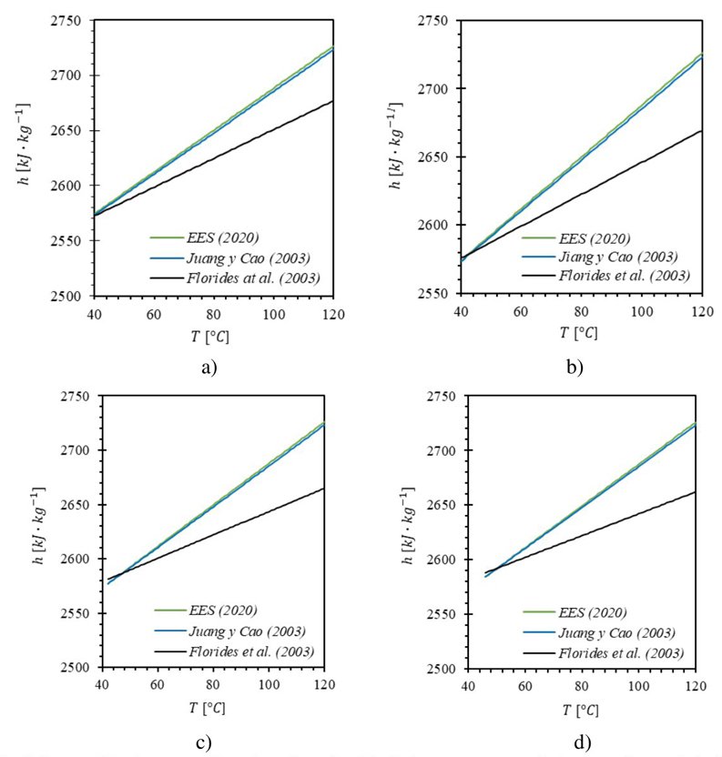 Los valores obtenidos para la entalpía específica de vapor saturado, en función de la temperatura, se ilustran en la Figura 4. Es posible apreciar que, en el rango de temperaturas analizado, la correlación propuesta por Jiang y Cao [31] y la propuesta por Florides et al. [35] estiman la entalpía específica de vapor saturado de forma satisfactoria, debido a que los valores se traslapan con los resultados obtenidos por el EES [33].