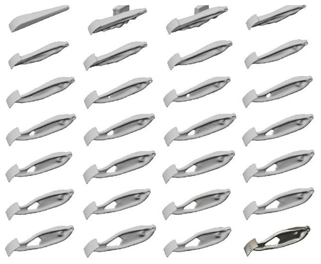 Cada iteración muestra el proceso de transformación de la estructura base hasta llegar al resultado final. De las tres soluciones obtenidas, dos de ellas fueron a través de método de fabricación aditiva (ver Figura 6 y Figura 7) y uno con método de fabricación sustractiva (mecanizado), ver Figura 8.