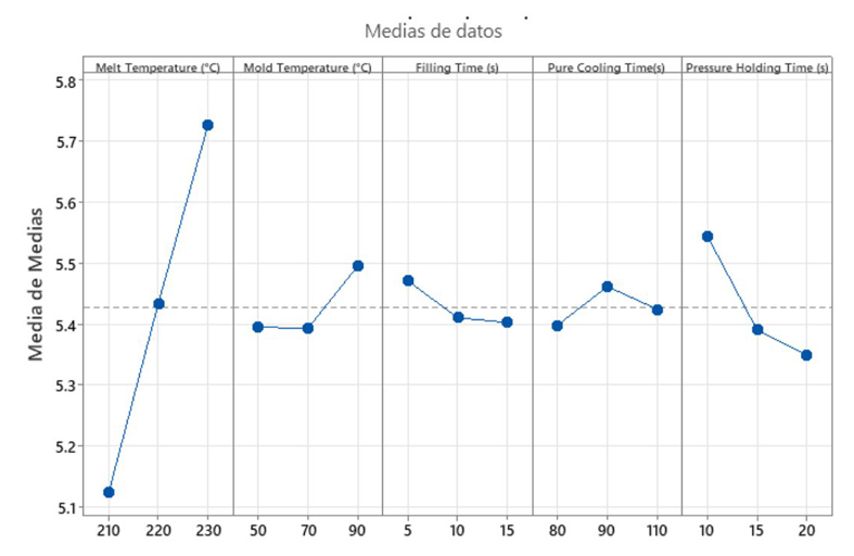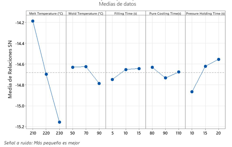 En la Figura 4 se puede observar de manera gráfica las variables independientes que aportan los mejores resultados para las variables de Melt Temperature, Mold Temperature, Filling Time, Pressure Holding Time y Pure Cooling Time. Aquellos valores cuya señal a ruido es mayor proveerán los valores con los cuales disminuirá la deformación en la cesta.