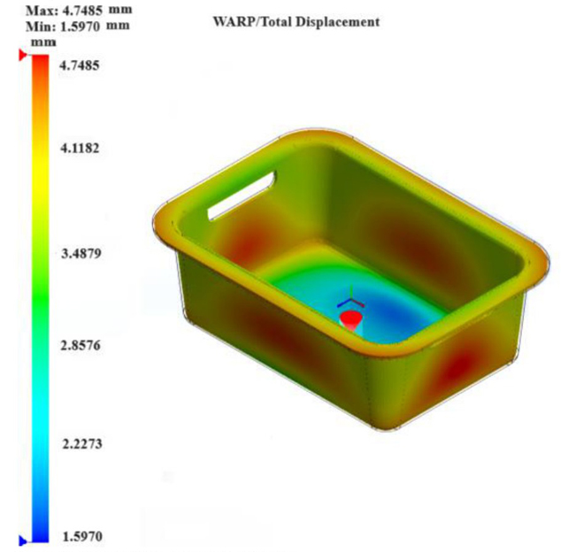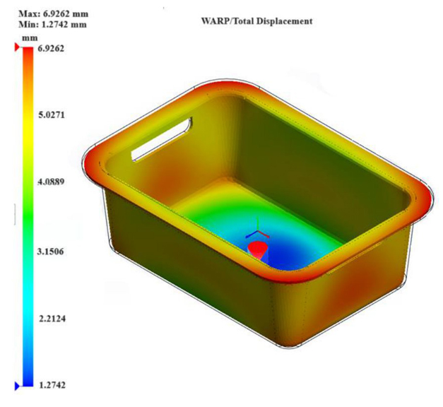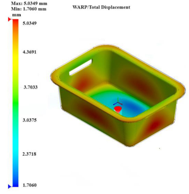 Los resultados mostrados en la Figura 5 son de una simulación de llenado donde no se controlaron las variables de Melt Temperature, Mold Temperature, Filling Time, Pressure Holding Time y Pure Cooling Time. La simulación de llenado presenta valores de deformación mínima de 1.2742 mm identificados con color azul en la base de la cesta y valores máximos de 6.9262 mm identificados por el color rojo ubicados en las zonas masa alejadas del punto de inyección.