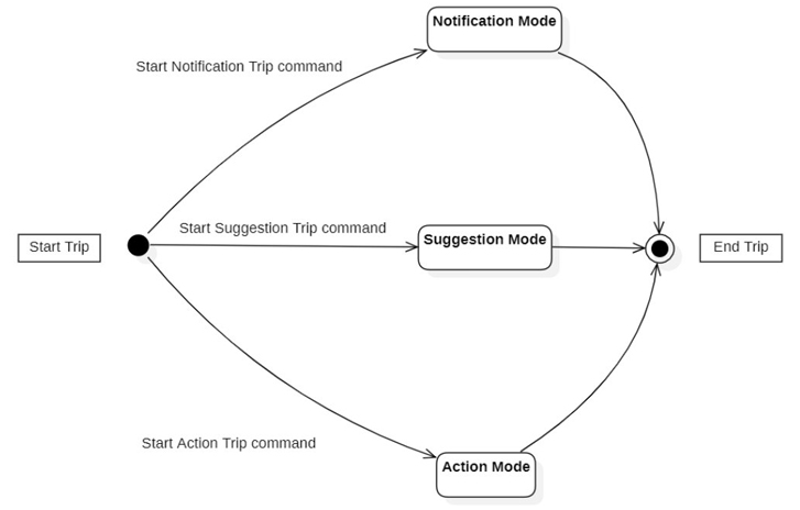 A simple state machine model was created to depict available Trip Modes, this is presented in “Figure 3. Trip Modes state chart”. To start a trip and enter one of the Trip Modes available, utterances are introduced by adding intent files presented in “Table 6. Trip modes intent files”.