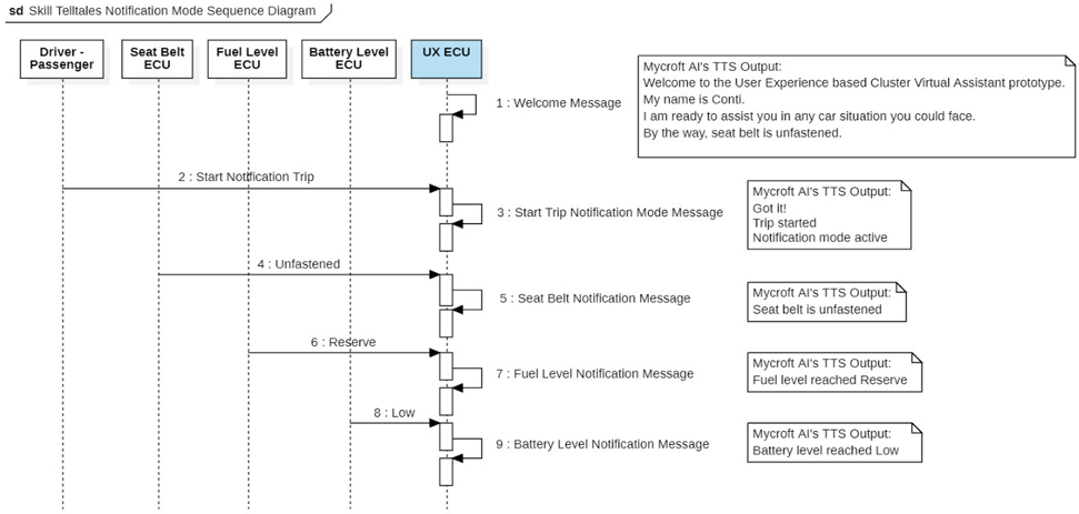 Simulated trip’s sequence of actions for each Trip Mode which takes into consideration utterances, dialogs and simulated ECU’s messages are shown in corresponding sequence diagrams. On “Figure 4. Skill Telltales Notification Mode sequence diagram”, after welcome message is provided by the voice communication module running inside an UX ECU, utterance from user is received to start a trip in Notification Mode, then simulated ECUs: Seat Belt, Fuel Level and Battery Level provide corresponding status to finally trigger notification messages with predefined simple sentence dialogs. Decision on what to do next relies on the user.