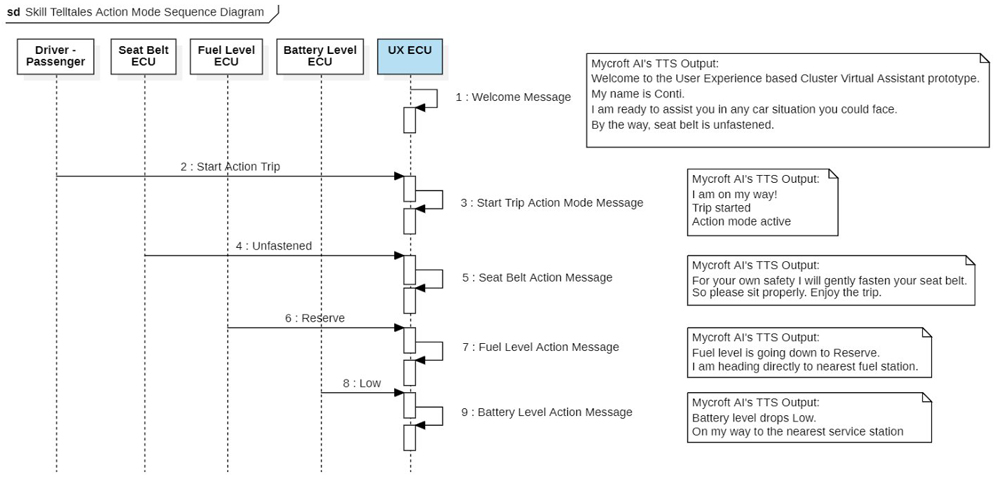 On “Figure 6. Skill Telltales Action Mode sequence diagram”, after welcome message is provided by the voice communication module running inside an UX ECU, utterance from user is received to start a trip in Action Mode, then simulated ECUs: Seat Belt, Fuel Level and Battery Level provide corresponding status to finally trigger action messages with predefined sentence dialogs based on context information about the car’s location. Decision of what to do next relies completely on assumed autonomous car.
