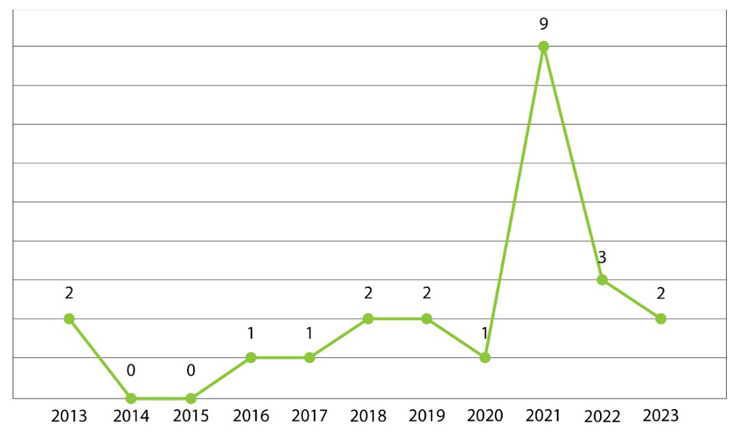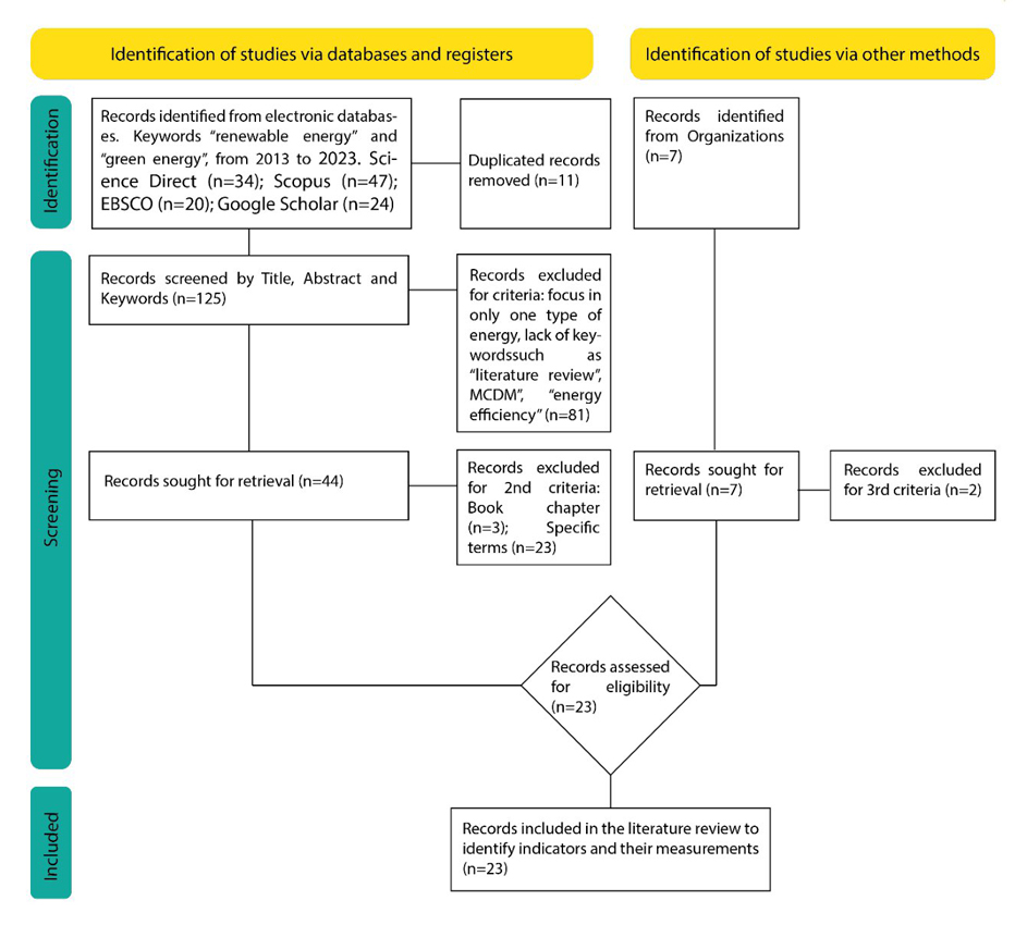 The authors employed the PRISMA 2020 method to include and exclude records from Science Direct, Scopus, EBSCO and Google Scholar, and other methods through records from organizations. For the literature survey, the search terms “renewable energy factors” AND “green energy” were applied, in a year range from 2013 to 2023, initially obtaining 103 records by eliminating 11 duplicated records. Then, the authors excluded records for not meeting the criteria in the initial screening in Title, Abstract and Keywords. In such a case, the results were reduced to 44 records. Furthermore, only articles, reviews and reports were chosen for the current study, published in English-language and those that had complete access to the entire document, reducing the included records to 23. From this point on, the articles were analyzed by year of publication. In “Figure 2: Year base publications of included records” shows that 2021 is the year where the largest number of articles reviewed are focused on, followed by 2022 with 3 records and 2023 with 2 records. This is an interesting observation taking into account that the United Nations in 2015 adopted the 2023 Agenda and its Sustainable Development Goals. Enterprises are working towards an industrial symbiosis where the substitution of fossil-fuel can be diminished little by little to open way for green energy production and consumption, where products are being reused or recycle [27].