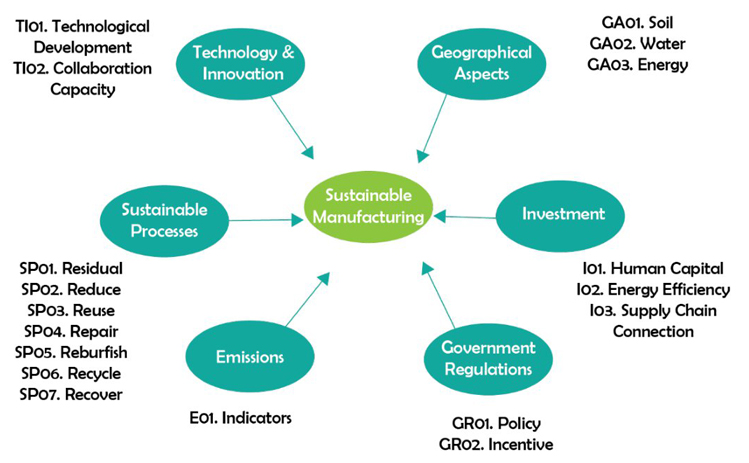 Every transition towards green energy consumption begins with the production of green energy sources, emphasizing in green energy policy, technology-push and market-pull [30]. As described by [27], the industry sector has an important goal to decrease CO2 emissions and have a positive effect in climate change by practicing measures towards usage efficiency in materials and energy. Nevertheless, this sector depends on a number of variables on the industry sector such as geographical location, government policy, technological and innovation source, adaptation and resilience challenges, among others [31-34]. On the other hand, adapting sustainable practices towards green manufacturing, enterprises seek benefits such as reputation and brand image, consumers’ preference on green products and services, and a positive change in economic performance [35, 36]. From the systematic review, six indicators were identified (1) Technology and Innovation, (2) Geographical Aspects, (3) Investment, (4) Government Regulations, (5) Emissions, and (6) Sustainable Practices as shown in Table 2. Each indicator was related to their respective measurements appropriate for creating and adapting green energy in sustainable manufacturing for SMEs.