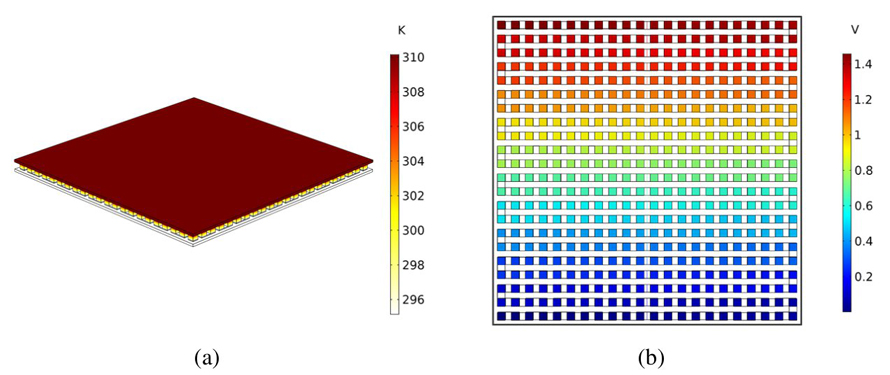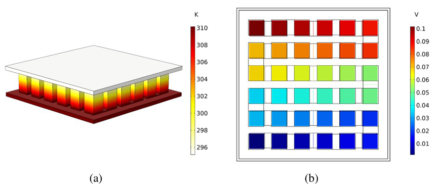 Figura 11 (a) Dispersión de la temperatura y (b) dispersión de potencial eléctrico para el TEG (μm).