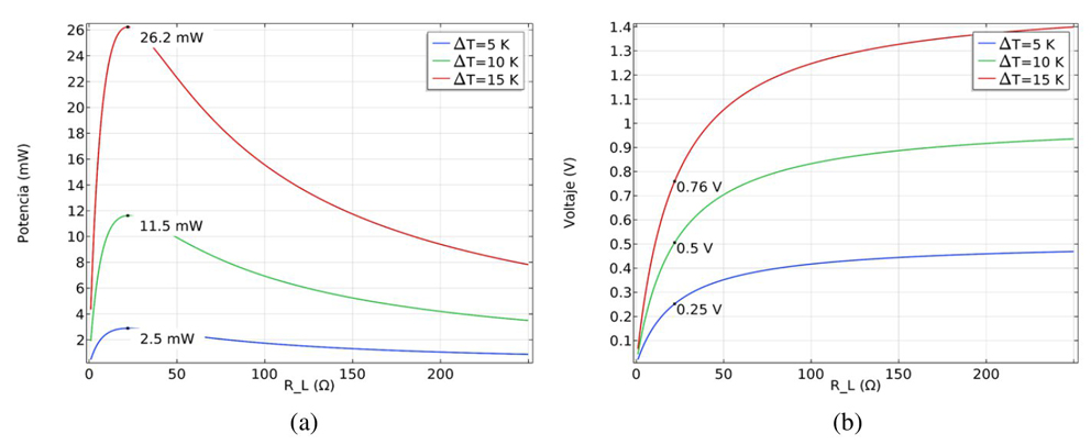 Para el modelado del efecto termoeléctrico, se definió un estudio estacionario paramétrico con el cual se evaluó la generación de energía termoeléctrica de acuerdo a una diferencia de temperatura ΔT con una resistencia de carga variable RL. La tabla 3 presenta los valores evaluados para cada uno de los modelos diseñados.