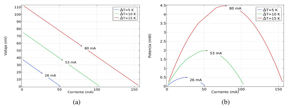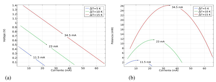 De la misma manera podemos caracterizar el funcionamiento del TEG (μm) de acuerdo a la corriente óptima para determinar la potencia máxima generada. En la figura 13 se presentan los gráficos del voltaje y la potencia en función de la corriente. Para cada uno de los gradientes de temperatura, ΔT, analizados, en la figura 13(a) podemos determinar el valor óptimo de la corriente de acuerdo al valor de voltaje óptimo establecido en la figura 12(b). En la figura 13(b) se muestra el punto de operación de la variable óptima de corriente de acuerdo a la potencia máxima generada por los tres diferenciales de temperatura, ΔT, analizados.