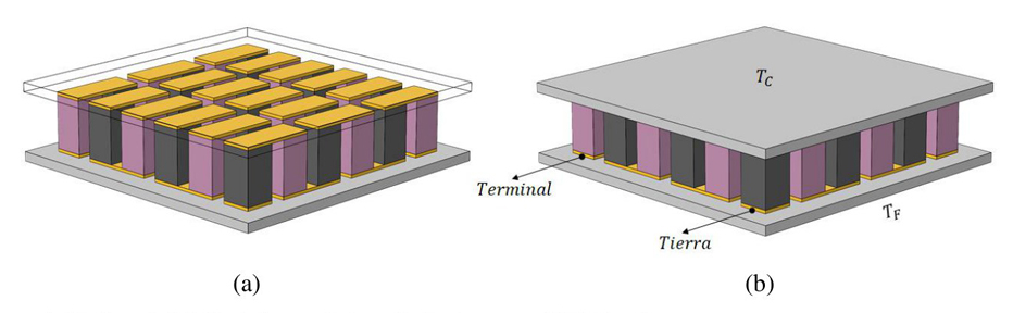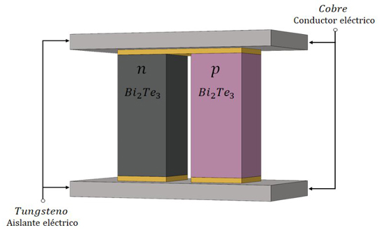 La figura 2 presenta el modelo CAD de un termopar de columnas de Bi2Te3, una tipo-N y una tipo-P conectadas eléctricamente en serie, por un electrodo de cobre y térmicamente en paralelo, por placas de tungsteno que funcionan como aislante eléctrico.