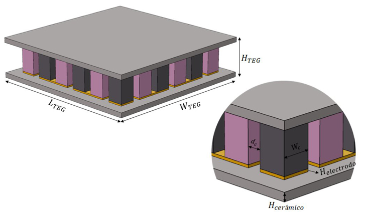 Para la simulación se diseñaron dos estructuras TEG de 1 cm² conformadas por un número n de termopares de acuerdo al área transversal de las columnas, para el primer TEG de 1 mm², y para el segundo TEG de 250 μm². La figura 3 presenta los parámetros físicos descritos a detalle en la Tabla 1 para el TEG (mm) y el TEG (μm).