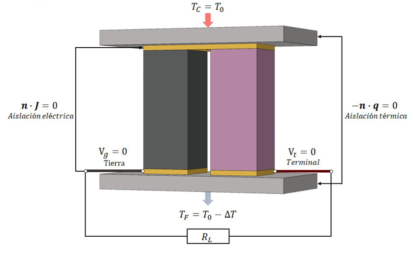 La generación de energía termoeléctrica es descrita por el fenómeno Seebeck el cual se describe como una fuerza electromotora que se genera a lo largo de un dominio conductor cuando existe un gradiente de temperatura, produciendo un voltaje eléctrico [26].