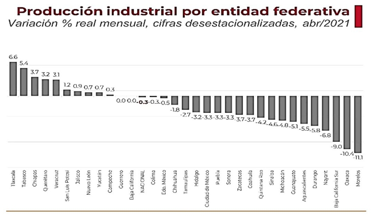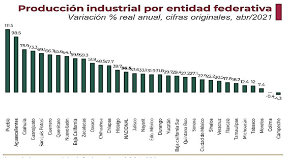 De igual manera, con cifras originales y con relación al mismo mes del año anterior, la actividad industrial avanzó en 30 entidades federativas de nuestro país en abril de 2021 (ver Figura 2), destacando Puebla (+111.5%), Aguascalientes (+98.5%), Coahuila (+75.9%), Guanajuato (+73.3%) y San Luis Potosí (+69.1%); en tanto que Colima y Campeche fueron los únicos estados que reportaron contracción anual en su actividad económica de 0.4% y 4.3%, respectivamente [2].