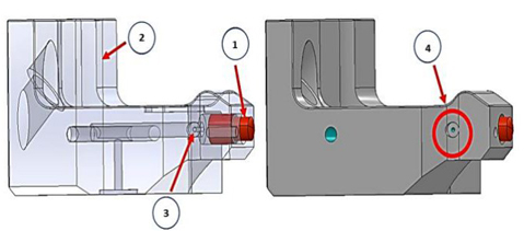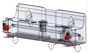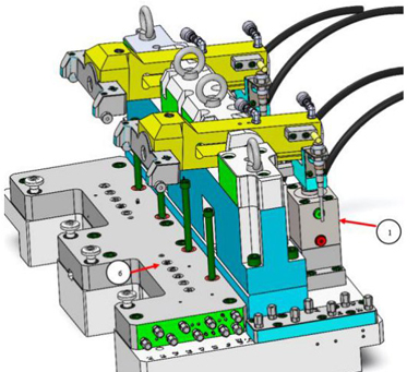 El dispositivo receptor de Bracket consiste en una placa conectora SMED de brocha diseñada para recibir los nidos de cambio rápido. En esta placa se integraron elementos que permitieron garantizar la conexión hidráulica de los nidos haciendo uso de válvulas check. El objetivo de utilizar estos elementos hidráulicos es permitir el flujo de fluidos en una sola conexión, manteniéndose abierta, pero si el flujo del fluido cambia, la válvula se cierra impidiendo el flujo inverso [24]. Adicional, para garantizar el correcto posicionamiento de los nidos de cambio rápido se hizo uso de elementos Speedloc (cambio rápido) [25] para permitir el posicionamiento en la placa de fijación sin ataduras ni bloqueos.