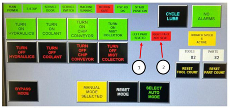 Para poder detectar la pieza presente en el dispositivo antes de iniciar el ciclo de mecanizado se instalaron dos presostatos de flujo en la máquina para detectar las diferencias de presión cuando el circuito está abierto o cerrado. Si la presión no se encuentra dentro de los límites establecidos, la máquina manda una alarma de “Dispositivo no apretado” e indica cuál de los dos nidos es el que no está siendo detectado.