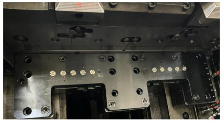 Finalmente, se realizó el montaje de los nidos independientes acorde a la posición definida en el diseño; Bracket trasero nido izquierdo (LH), Bracket delantero nido derecho (RH). Una vez montados los nidos en la máquina se colocaron los tornillos y Speedloc para fijarlos a la placa receptora. En la Figura 15 se observa el montaje de los nidos independientes en la placa receptora.