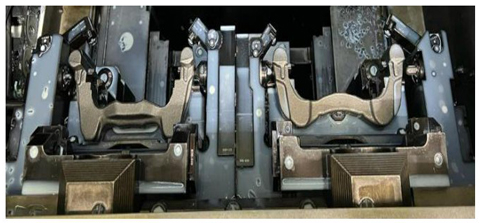 Para poder realizar un ciclo de maquinado con piezas de forja de Bracket, se verificó que la herramienta de corte no tuviera interferencias con el dispositivo de sujeción, posterior a eso se realizó el primer ciclo de maquinado sin ninguna interferencia de la pieza con el dispositivo de sujeción y la herramienta de corte. En la Figura 16 se muestra el primer ciclo de maquinado de forja de Bracket trasero y Bracket delantero.