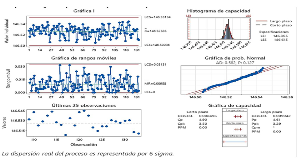 Debido a la criticidad de la característica se sometió el proceso a un estudio de capacidad (Cpk y Ppk) para determinar si la habilidad del proceso se encuentra o no bajo control en un periodo determinado, es decir, no hay puntos fuera de los límites de control del componente a lo largo del tiempo.