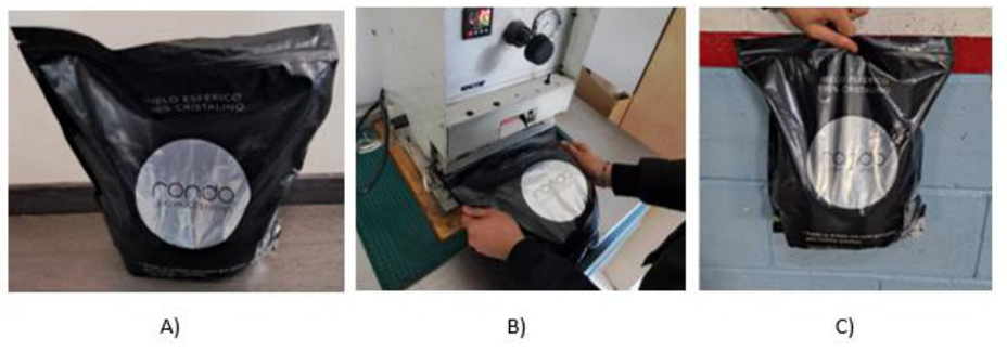 Figure 1 Methodology procedure corresponding to the drop test in flexible packaging (Doypack) A) Packaging filled with product, B) Packaging sealing, C) Fall from a 1m high