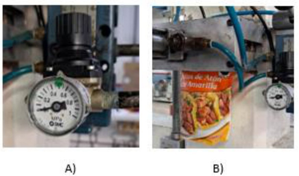 Figure 3 Air-pressure test in a flexible package. The package is pressurized to 0.1 MPa for 60 seconds, ensuring no rupture or leak of air A) Manometer and B) Air pressure packaging sample.