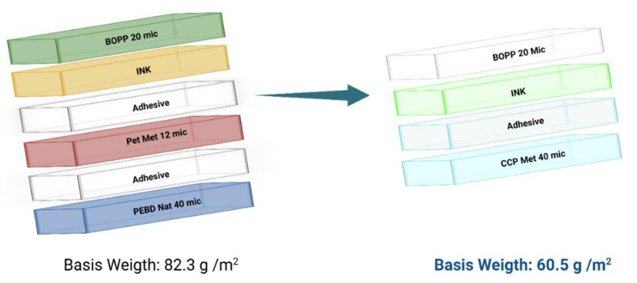 This study shows that it is possible to reduce the number of lamination layers in flexible packaging such as Doypack and laminated coil because the mechanical, physical, and barrier properties are not affected and, in some cases, can be improved. This benefits the reduction of the environmental impact due to the consumption of raw materials. In addition, it generates an economic reduction in sales prices, increasing the product's profit margin.