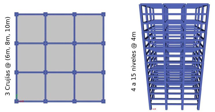 Los modelos a analizar son edificios de concreto reforzado formados por marcos rígidos de vigas y columnas, en los entrepisos se le ha asignado losas macizas de concreto que tiene la función de diafragmas rígidos. Las diferentes estructuras tienen 4, 6, 8, 10, 12 y 15 niveles con una altura de entrepiso de 4 metros. Estos edificios constan de 3 crujías en la dirección X y 3 crujías en la dirección Y. La separación entre las crujías es de 6 metros para los edificios de 4 niveles, de 8 metros para los edificios de 6, 8, 10 y 12 niveles, y para de 10 metros para los edificios de 15 niveles. La Figura 2 muestra la vista en planta y el modelo de los edificios.