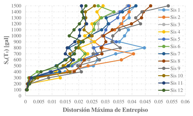 El método usado en este trabajo para estimar completamente el comportamiento estructural de los edificios de una manera probabilística es el análisis dinámico incremental (ADI) [34]. En este análisis se grafican el daño máximo provocado a la estructural por la excitación de los movimientos sísmicos a los cuales se sometió el edificio en los análisis no lineales. Como resultado se obtienen varias curvas paramétricas formadas por puntos que representan los daños máximos obtenidos de los análisis no lineales que están en función de la aceleración a la cual se escaló el registro sísmico que excitó la estructura. La Figura 4 muestras las curvas ADI para un edificio de C/R de 12 niveles diseñado con la combinación #1 ubicado en suelo con periodo Ts=2.0.