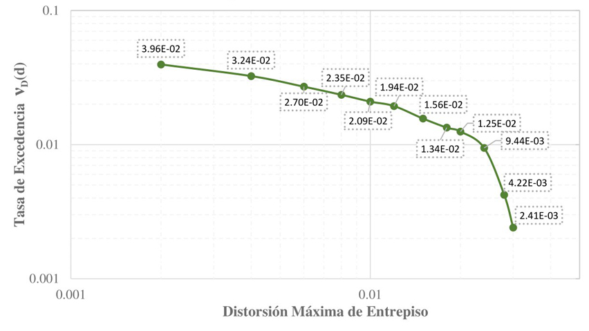 El desempeño sísmico de los edificios de concreto reforzado en este trabajo se cuantifica mediante las curvas de peligro de demanda estructural [38]. Estas curvas integran la fragilidad de los edificios con el peligro sísmico del lugar donde se encuentran la estructura para estimar la tasa anual de exceder o alcanzar un nivel de daño. Las curvas de peligro de demanda estructural (CPDE) se calculan graficando el conjunto de tasas de excedencia que son obtenidas con la ecuación 2 para los diferentes niveles de daño (d).