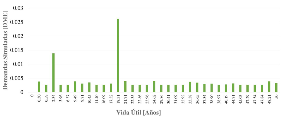 La figura 7 muestra un escenario de simulación de demandas durante el ciclo de vida útil del edificio de 12 niveles ubicado en suelo con periodo Ts=2.0s. En el eje de las abscisas se presentan los tiempos de los eventos sísmicos obtenidos mediante el método de la transformada inversa. En el eje de las ordenadas se presentan las distorsiones obtenidas mediante la simulación de Monte Carlo para cada evento sísmicos en un periodo de 50 años.
